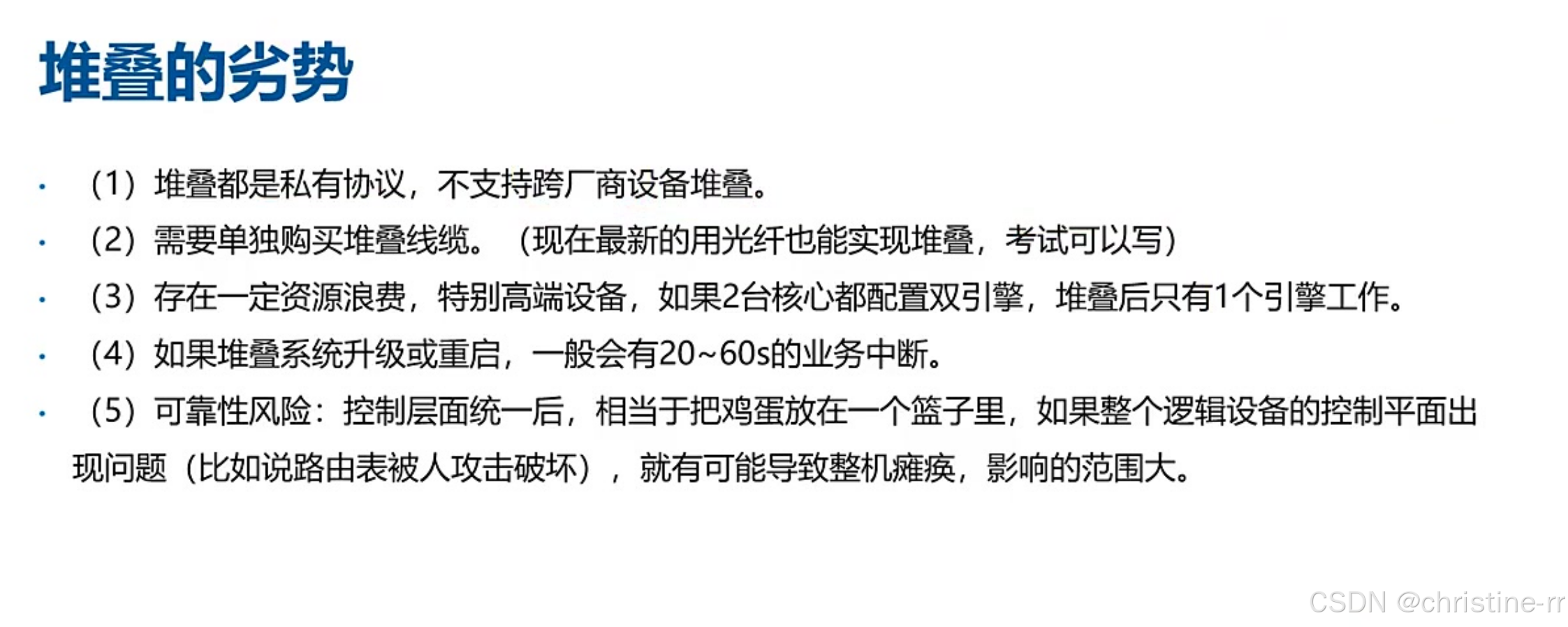 堆叠的劣势 | 私有协议、资源浪费、业务中断风险等 | 堆叠的核心考点 | 高 |