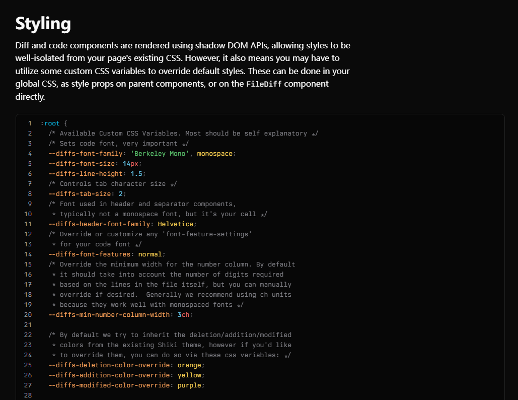文档写得挺详细的,每个API都有代码示例,可以去官网查看完整文档:https://diffs.com/docs