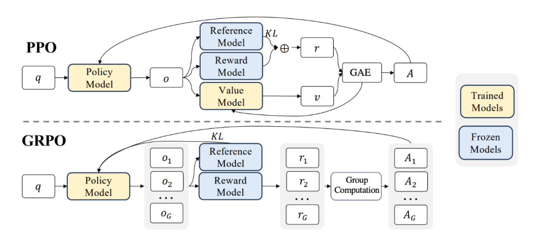 在PPO中,价值函数需与策略模型协同训练;为缓解奖励模型的过度优化问题,标准做法是在每个 token 的奖励中加入来自参考模型的逐 token KL 散度惩罚项。