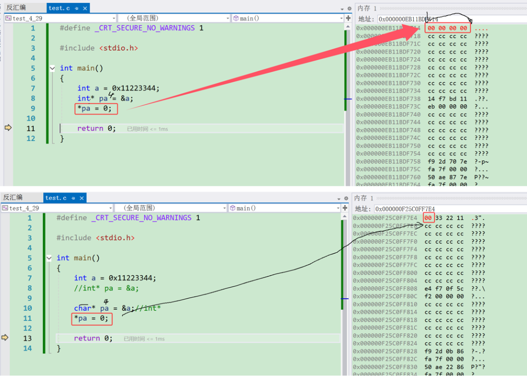 我们可以观察到,代码1会将n的4个字节全部改为0,但是代码2只是将n的第一个字节改为0。