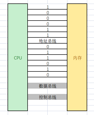 但是硬件与硬件之间又是相互独立的,那么它们应该如何进行通信呢?答案很简单,用“线”连起来。而CPU与内存之间也存在着大量的数据交互,所以两者也必须用线相连。不过我们今天只需要关心一组线,叫做地址总线。如下图所示: