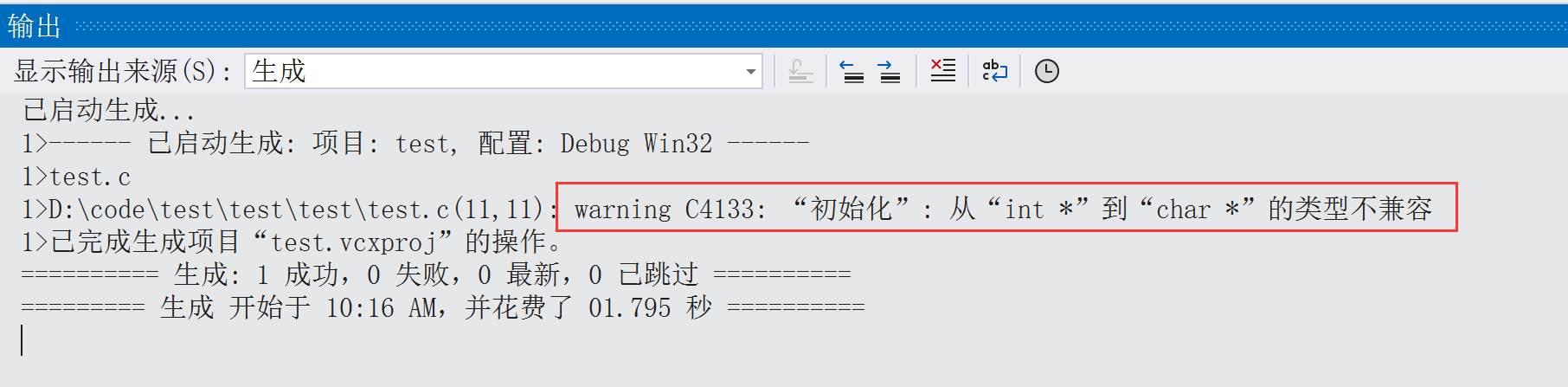 }在上面的代码中,我们将一个int类型的变量的地址赋值给了一个char*类型的指针变量。编译器这时给出了一个警告(如下图所示),是因为类型不兼容。而如果我们使用void*类型的指针就不会存在这样的问题。