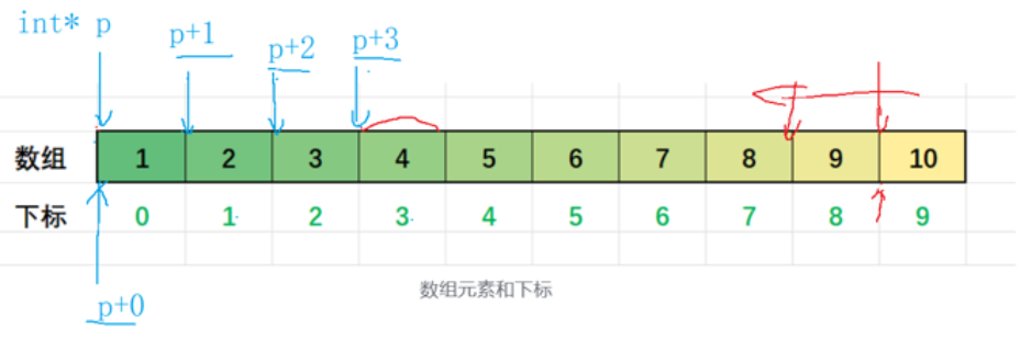对于数组p而言,p就表示数组中首元素的地址,也就是一个指向数组中首元素的指针,在这为 int* 类型。因此 p+1 就表示p指针向后移1位之后所指向的元素地址,同理也就可以知道 p+i 就表示p指针向后移i位之后所指向元素的地址,即数组中下标为i的元素的地址,*(p+i)就是下标为i的这个元素。