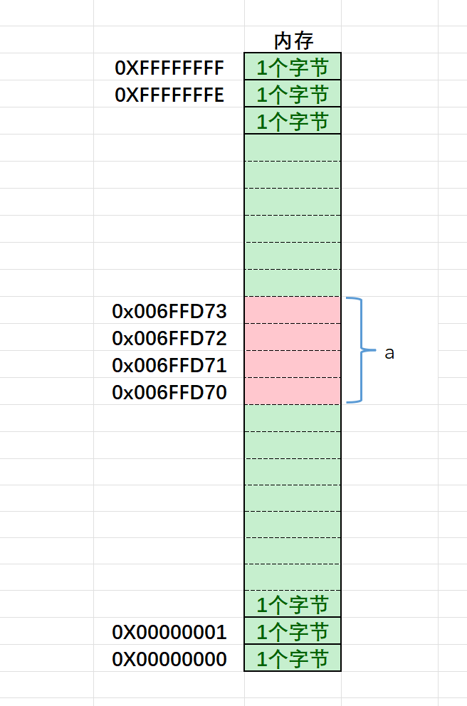 比如,上述的代码就是创建了整型变量a,内存中申请4个字节,用于存放整数10,其中每个字节都有地址,上图中4个字节的地址分别是: