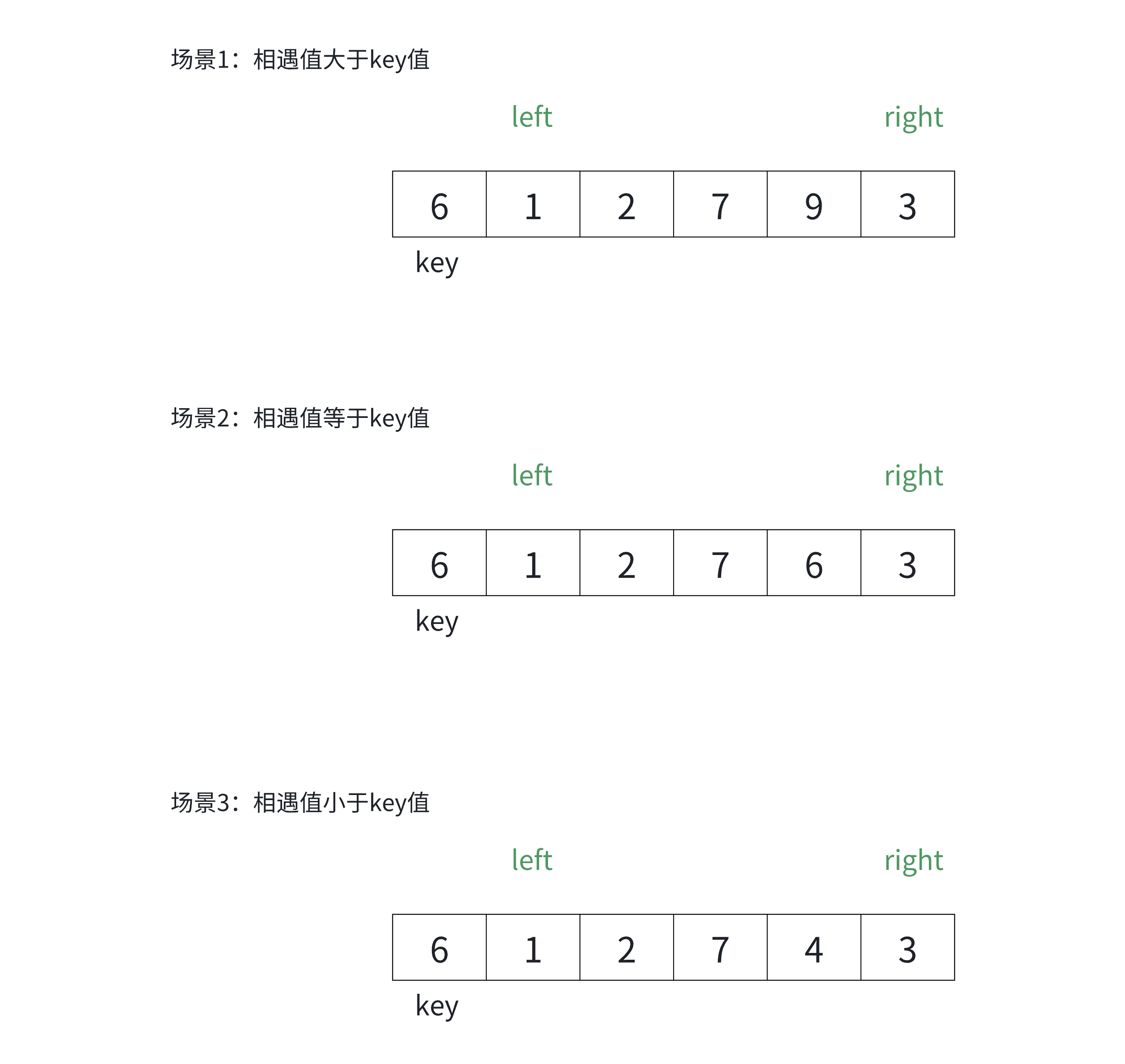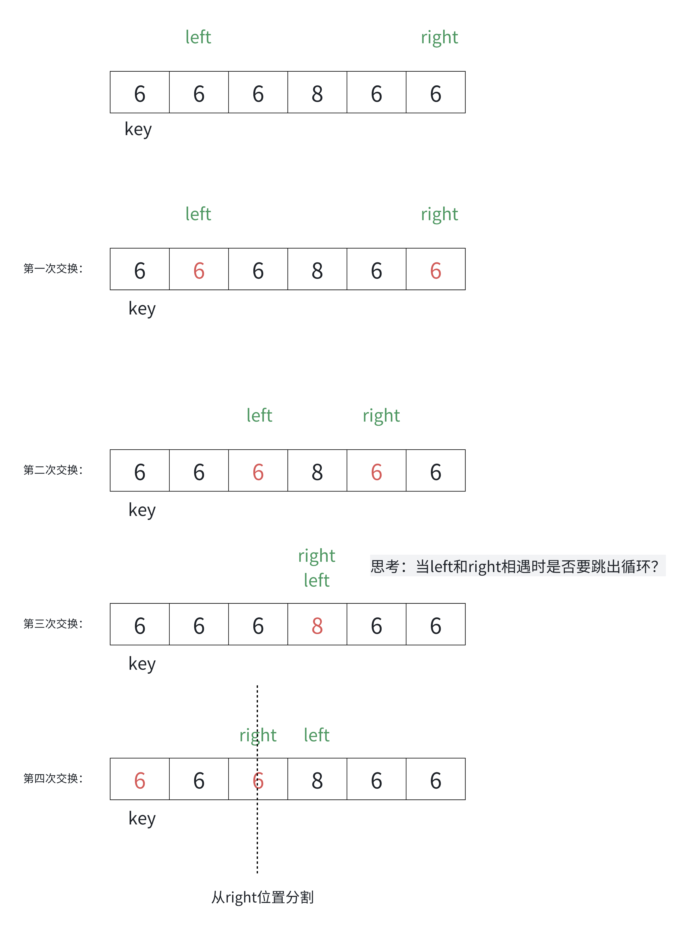 当 left > right 时,即 right 走到 left 的左侧,而 left 扫描过的数据均不大于 key,因此 right 此时指向的数据一定不大于 key。我们可以画图分析讨论: