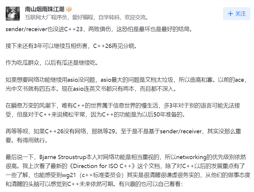 C++⼀直被诟病的⼀个地⽅就是⼀直没出网络库(networking),networking之前是在C++23的计划中的,现在C++23已经发布了,但是没有networking,于是网上就引发了⼀系列的吃瓜和吐槽。中间过程就像发生了宫斗剧⼀样。