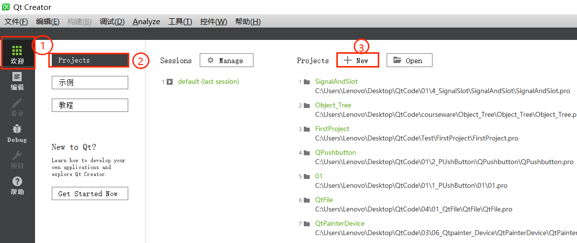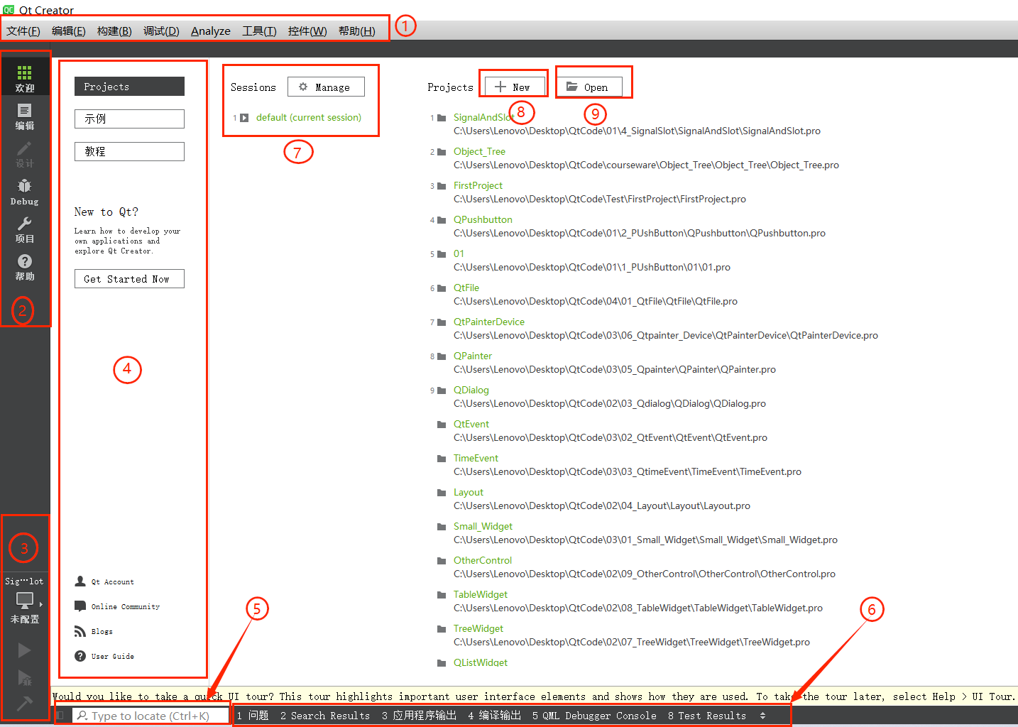 启动 Qt Creator 后,首先进入欢迎模式,该模式是开发者快速开展工作的入口,主要包含以下的功能区域:
