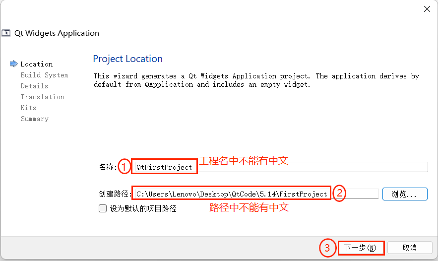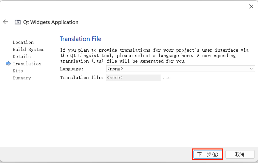 默认会显示已安装的 Qt 构建套件(如 “Desktop Qt 5.14.2 MinGW 64-bit”),直接勾选该套件,点击 “下一步(N)”。