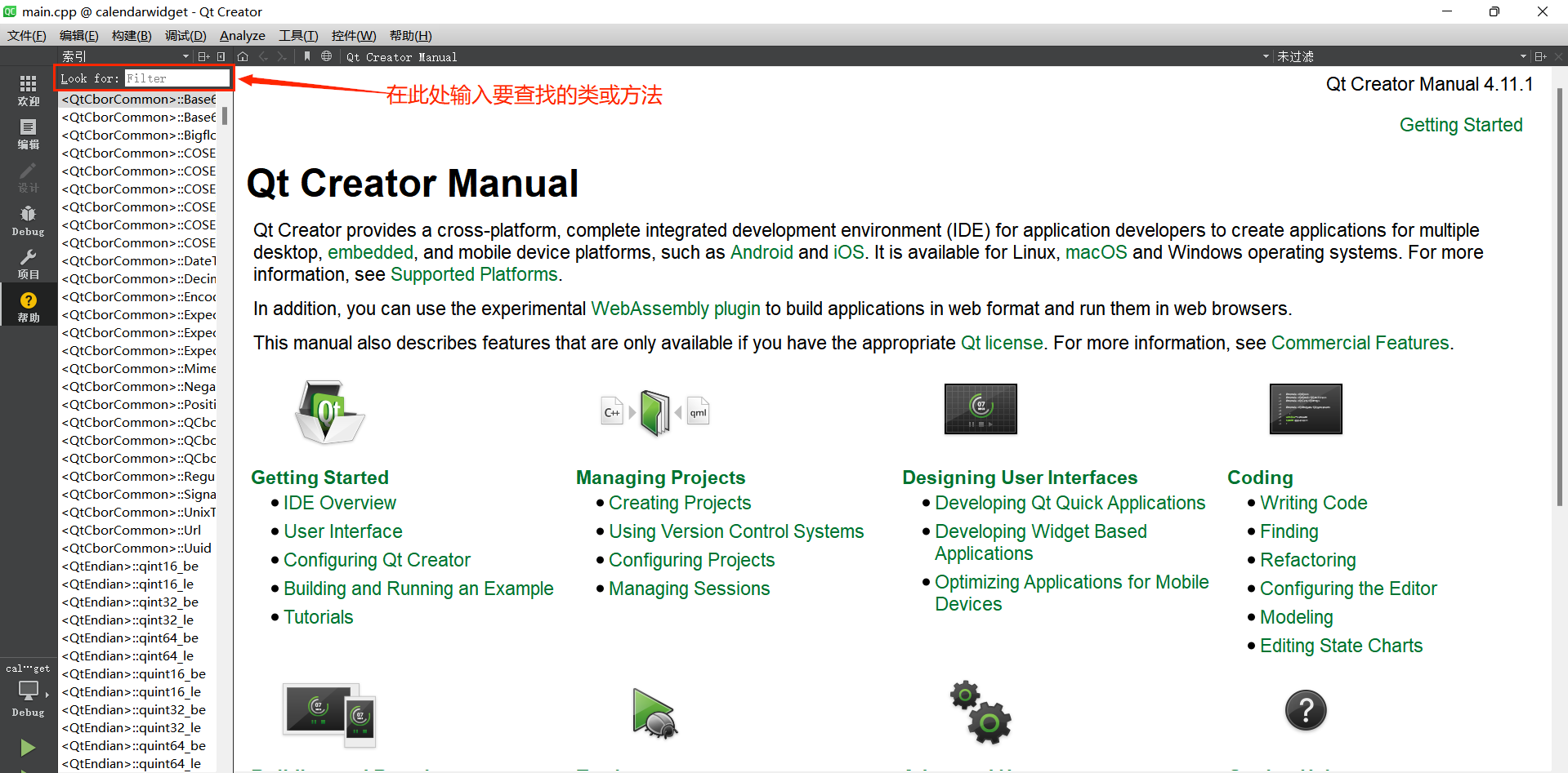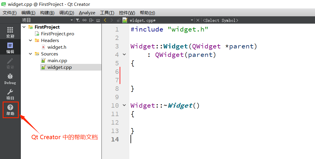 帮助(Help) | 打开 Qt 帮助文档(F1)、查看 Qt Creator 版本信息、管理插件等帮助类操作 |