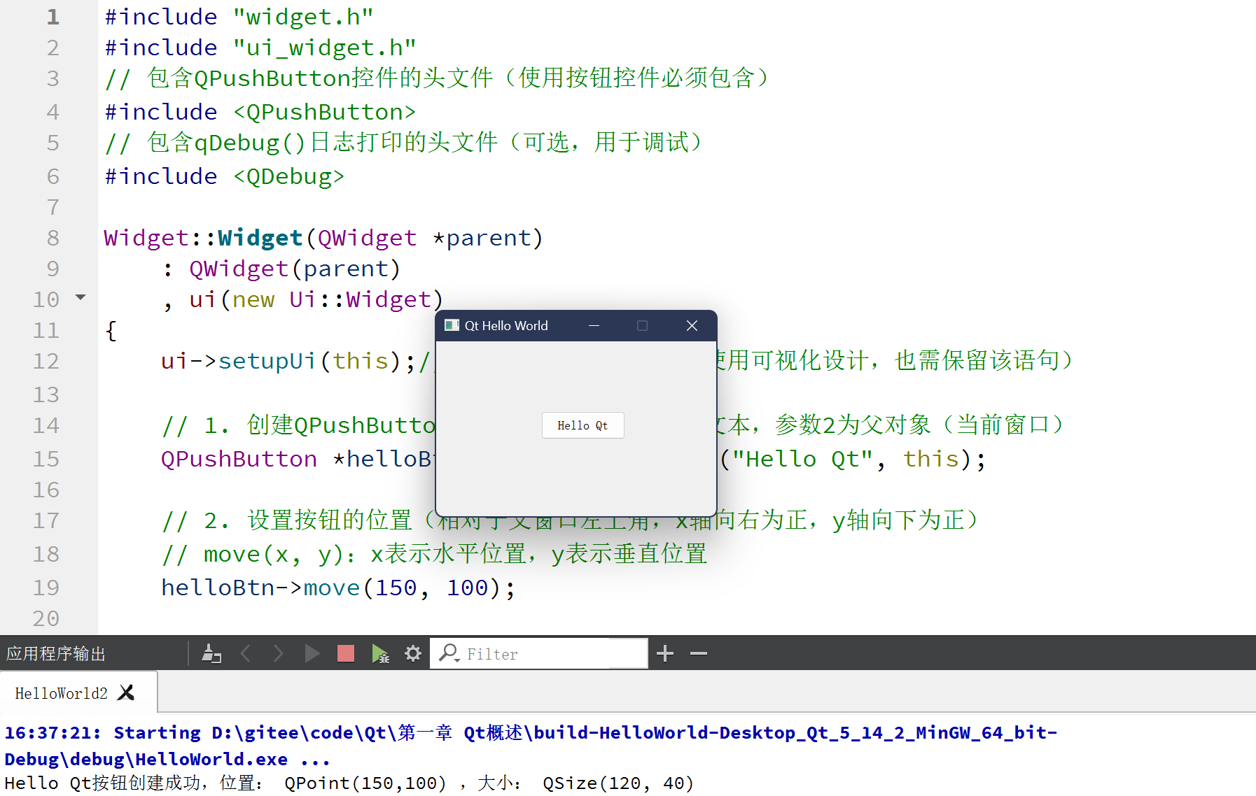 qDebug() << "Hello Qt按钮创建成功,位置:" << helloBtn->pos()