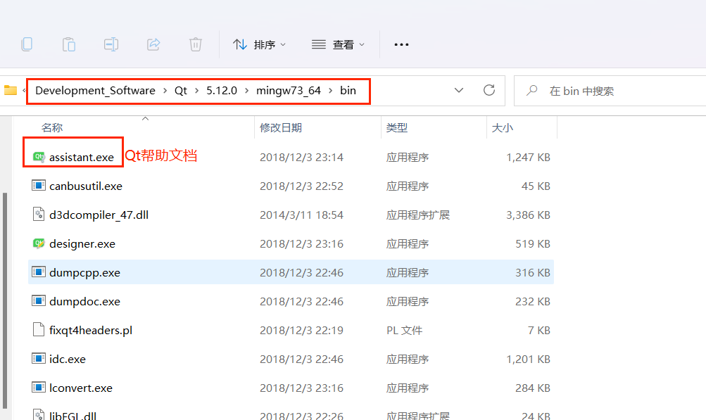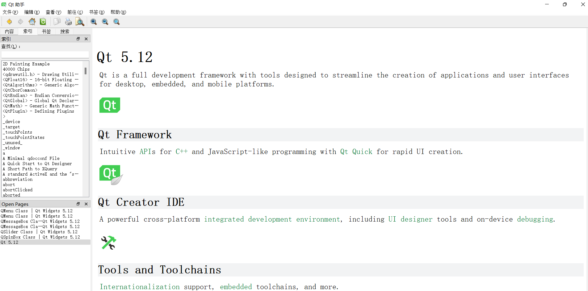 bin文件夹(如D:\Development_Software\Qt\5.14.2\mingw73_64\bin),双击assistant.exe,启动独立的 Qt 助手。该工具功能与 Qt Creator 的帮助模式一致,但可独立于 Qt Creator 运行,适合在编写代码时同时查阅文档。