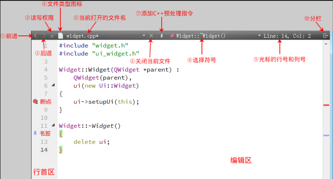Widget类的构造函数、析构函数以及从父类QWidget继承的成员函数,方便快速定位类的定义与实现。代码编辑区是开发者编写代码的核心区域,Qt Creator 为其提供了丰富的功能,大幅提升编码效率: