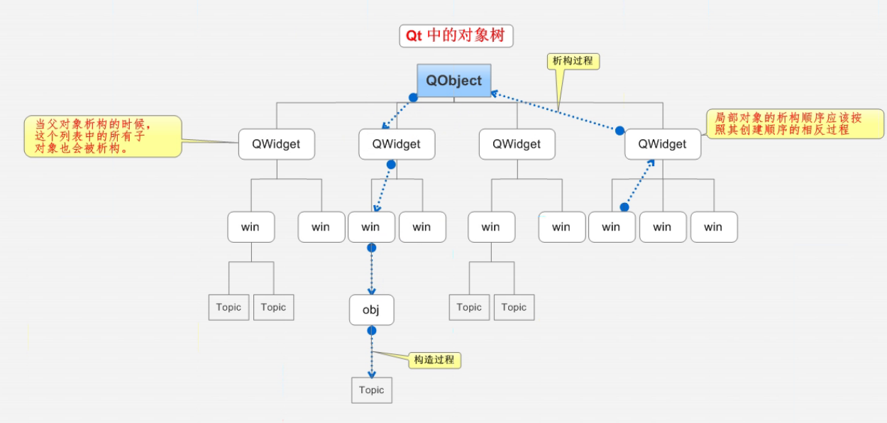 parent参数指定父对象。子对象会自动添加到父对象的children()列表中,形成树形结构(对象树)。children()列表,析构所有子对象;若子对象被手动析构(如delete child),会自动从父对象的children()列表中移除,避免父对象析构时重复释放。