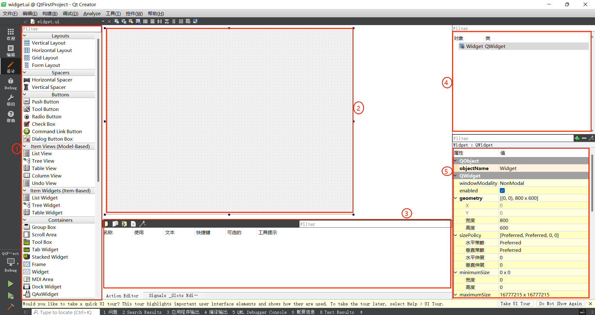 在 “项目视图” 中,双击widget.ui文件,Qt Creator 会自动切换至设计模式,界面分为 “组件选择窗口”“UI 设计窗口”“属性设置窗口”“对象浏览窗口” 四大模块: