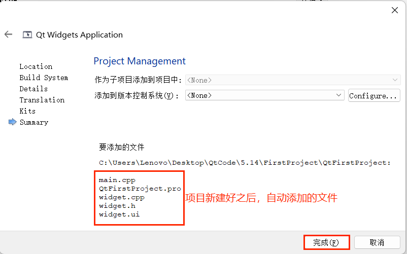在 “项目管理” 界面,默认不添加版本控制系统(后续可手动集成 Git),点击 “完成(F)”,Qt Creator 会自动生成项目文件,并进入编辑模式。