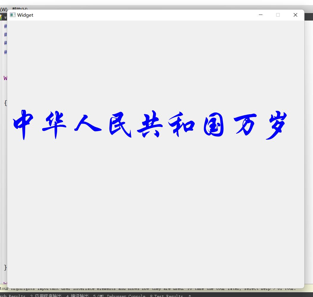 }运行程序后,会弹出一个 1000×600 像素的窗口,窗口中央显示蓝色、64 号 “华文行楷” 字体的 “中华人民共和国万岁” 文本,效果如下图所示: