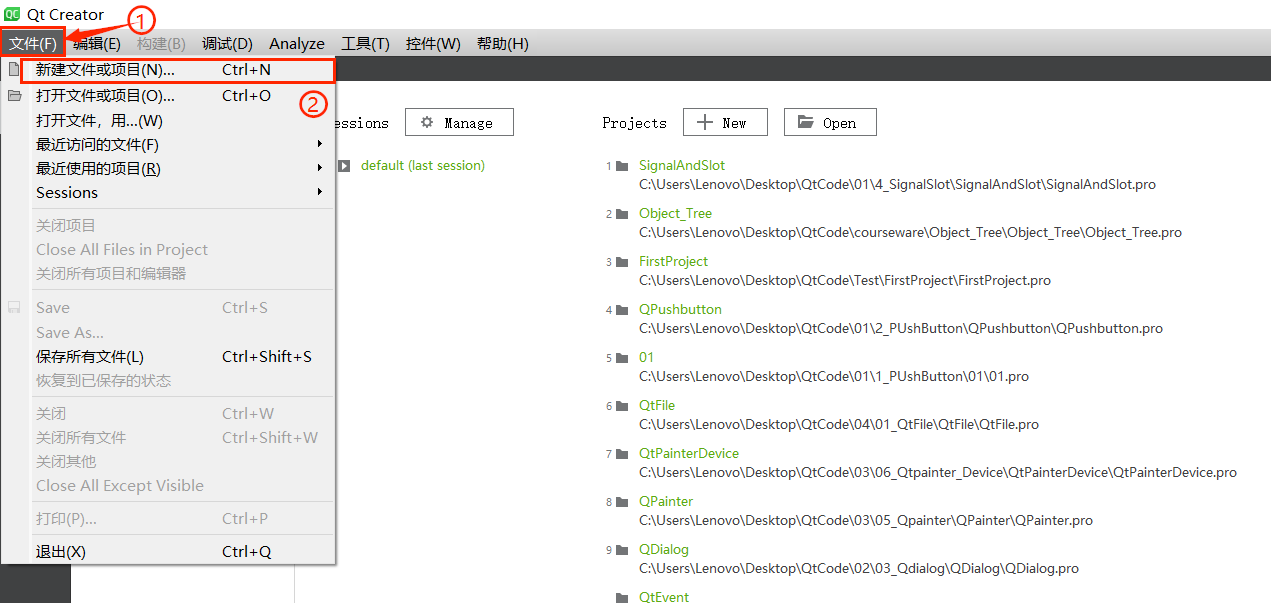 菜单栏包含 8 个核心菜单,覆盖了 Qt Creator 的所有操作功能,具体如下表所示:
