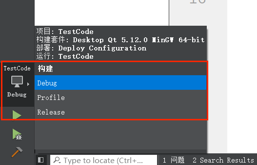 该区域位于界面的左下角,包含了 4 个功能,是控制项目构建、运行、调试的关键: