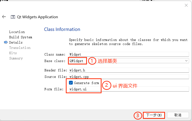 此处选择默认的 “QWidget”,勾选 “Generate form”(生成 UI 设计文件),点击 “下一步(N)”。