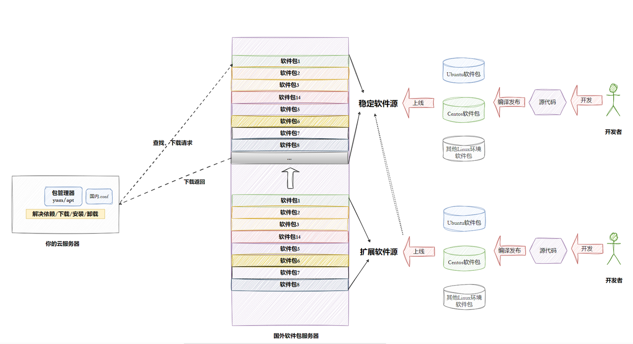 软件源仓库(Repository)是存储软件包的远程服务器,相当于包管理器的 “软件超市”。每个 Linux 系统都会配置默认的软件源,用户也可以添加第三方软件源或国内镜像源。