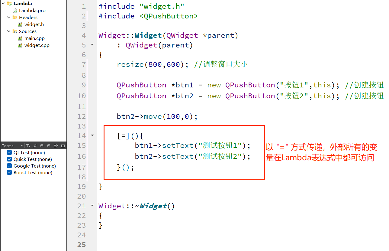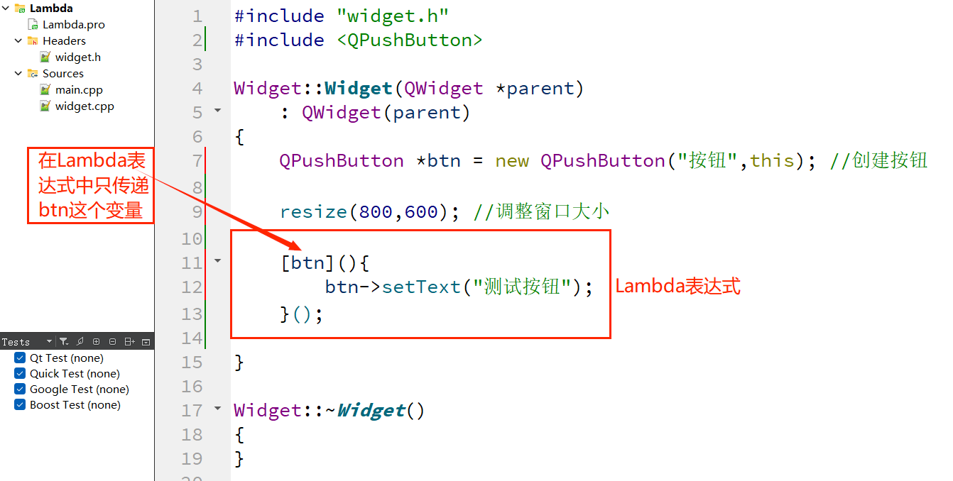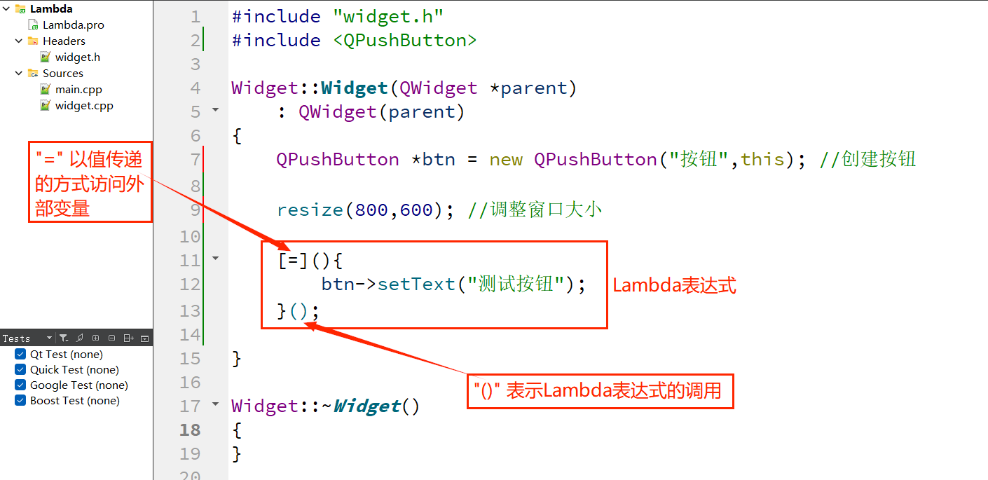 Qt5 引入了对 C++11 Lambda 表达式的支持,允许直接在connect函数中定义槽函数的逻辑,无需单独声明槽函数。这种方式特别适合简单的槽逻辑(如一行代码),能极大简化代码结构。