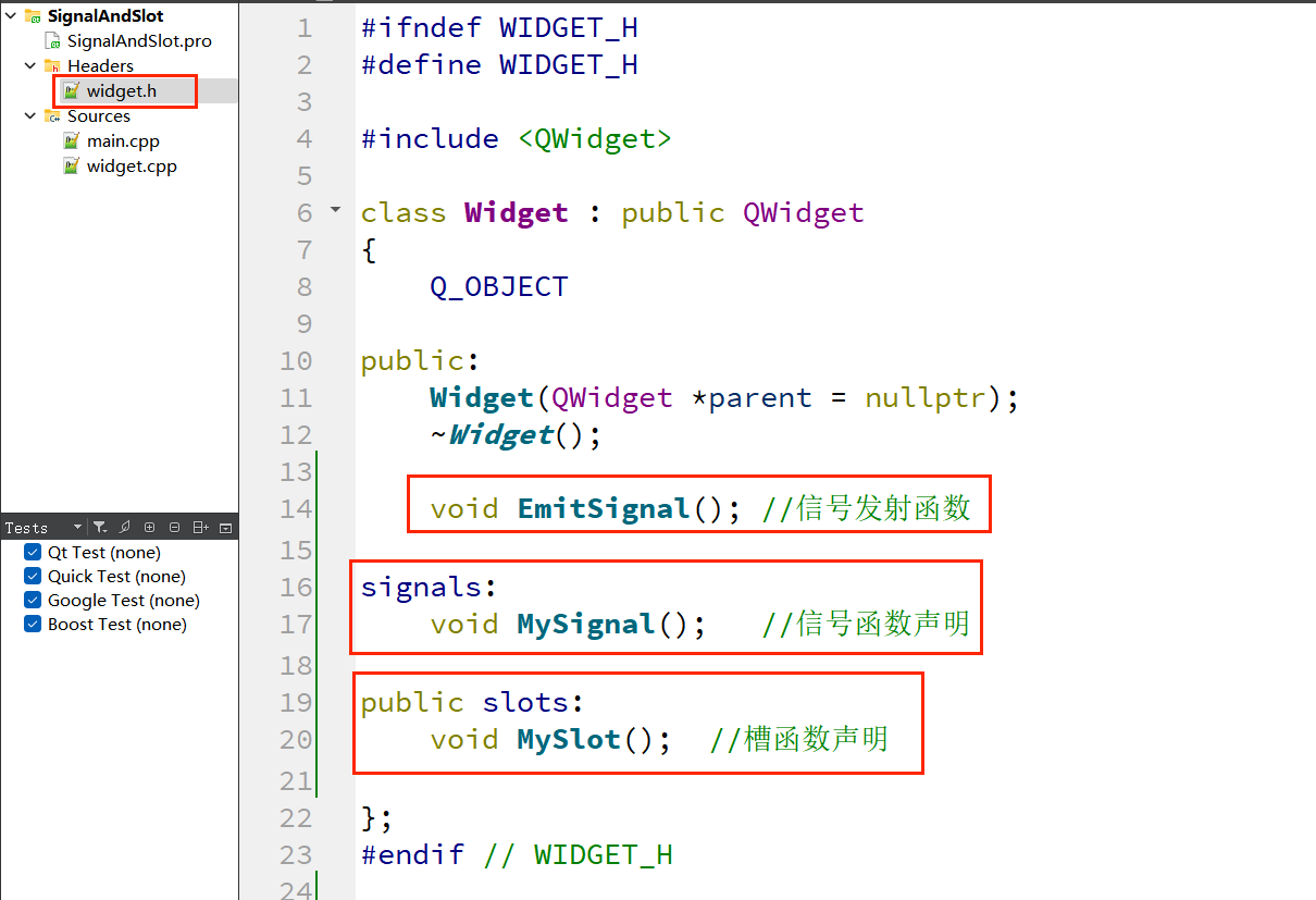 );(1)在头文件"widget.h"中声明信号与槽: