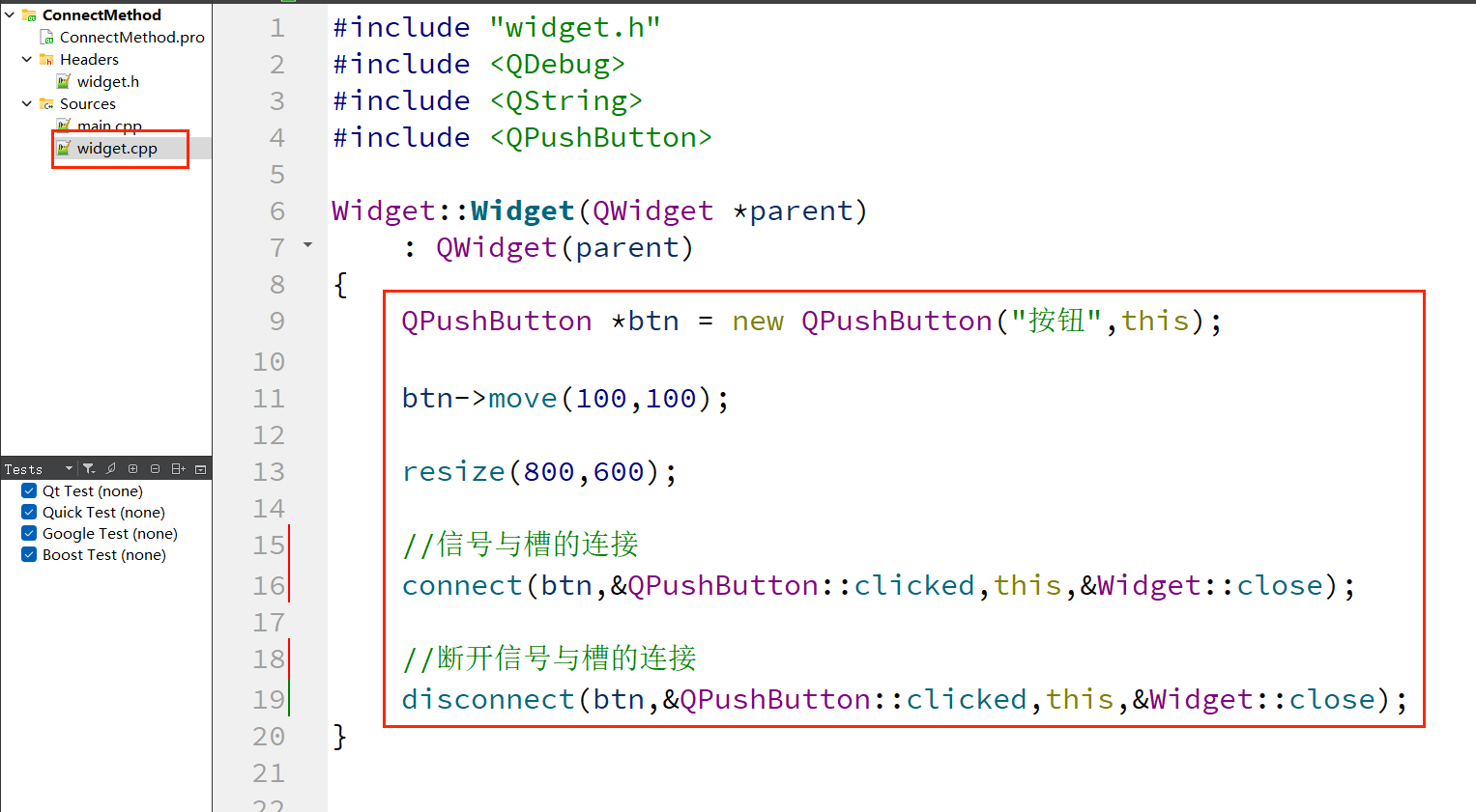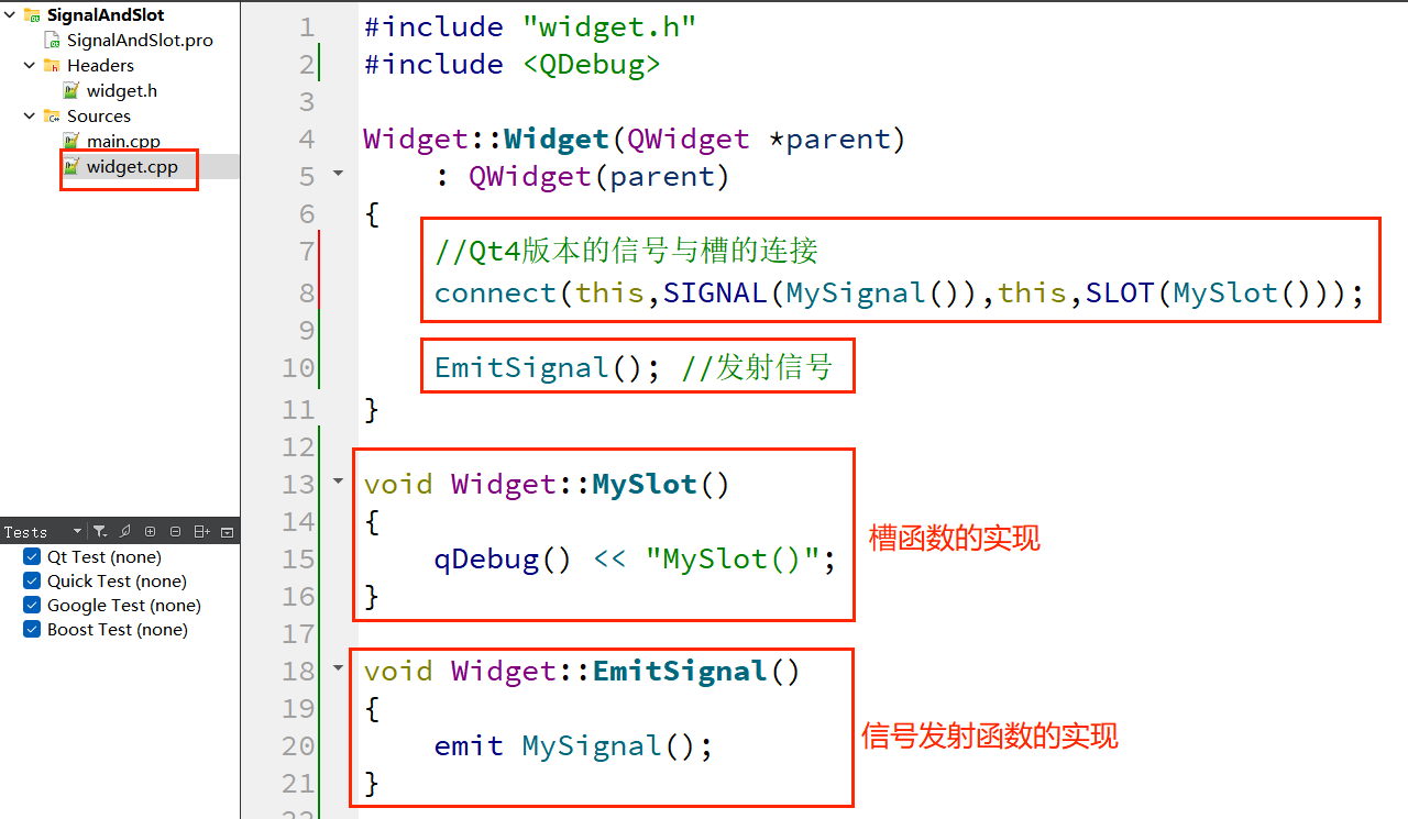 (2)在"widget.cpp"中实现槽函数并连接信号与槽: