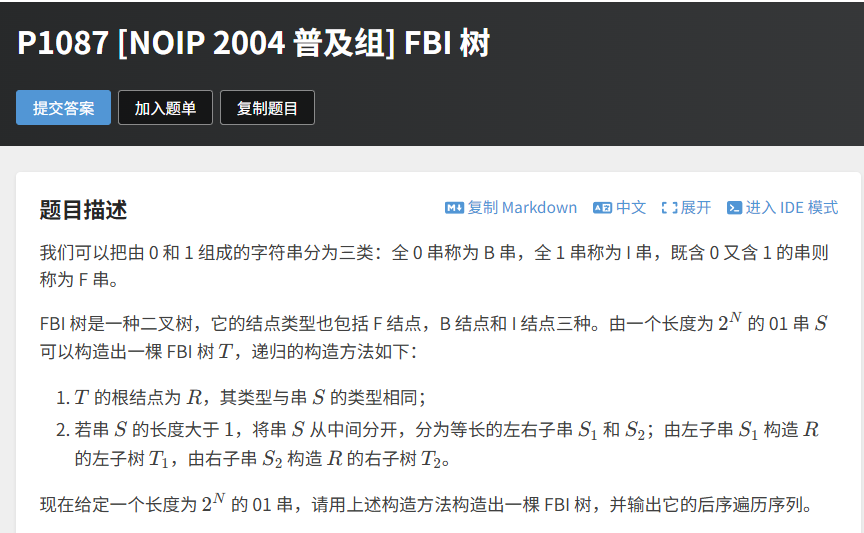 我们的任务是,给定一个长度为2^N的 “01” 串,构造出对应的 FBI 树,并输出它的后序遍历序列。