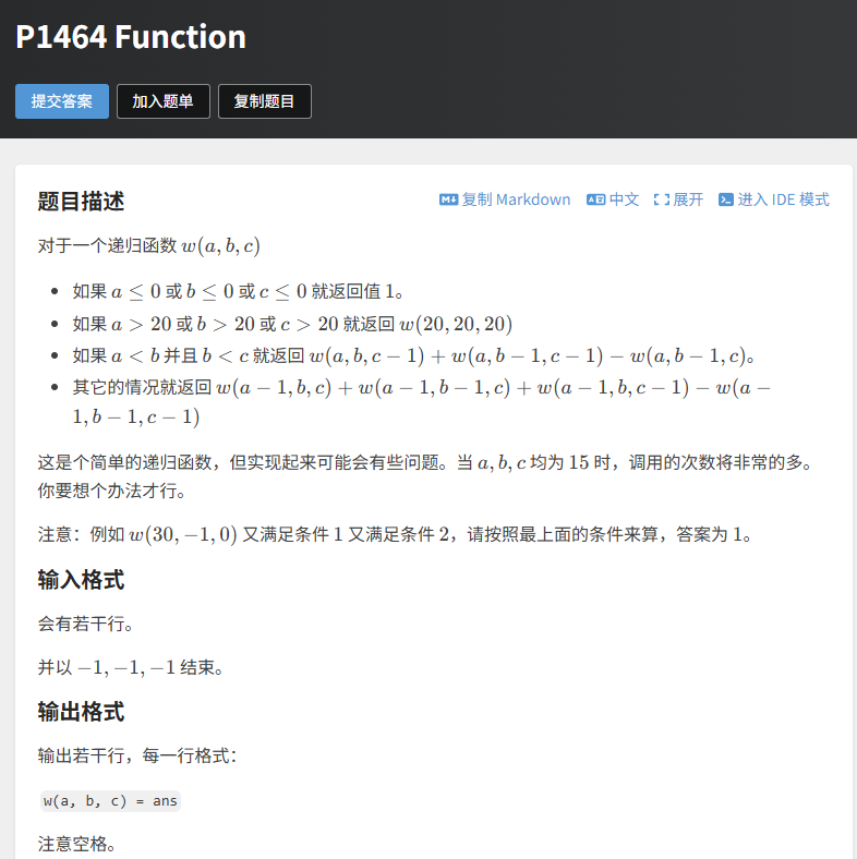 该函数的递归过程存在大量重复子问题。例如,w (5,5,5) 会多次调用 w (4,4,4)、w (4,4,3) 等 —— 如果不记忆化,当 a、b、c 接近 20 时,递归次数会爆炸式增长,导致超时。