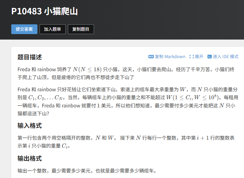 题目描述:N 只小猫坐索道下山,每辆缆车最大承重量为 W,每只小猫重量为 C_i。求最少需要多少辆缆车。