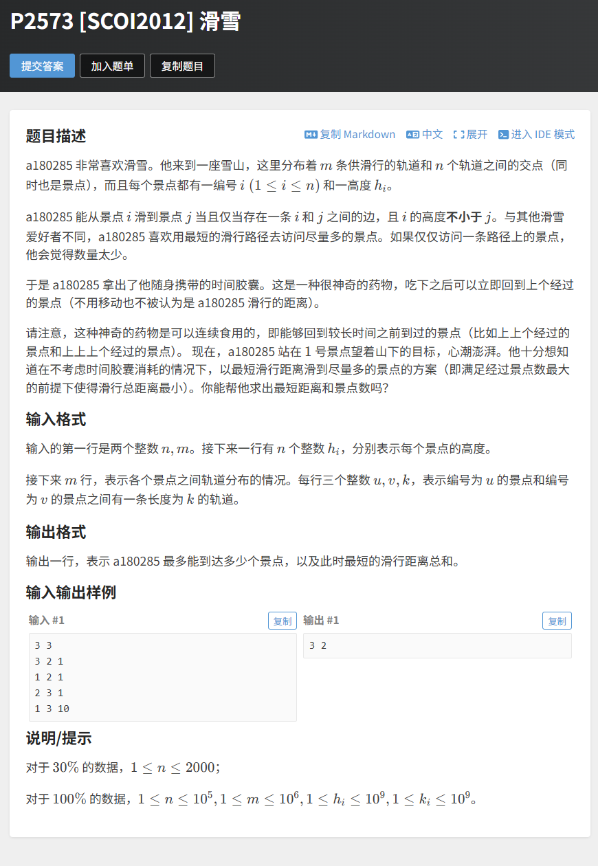 雪山有 n 个景点(顶点),m 条轨道(边),每个景点有高度 h_i。可以从景点 i 滑到 j 当且仅当 h_i ≥ h_j。可以使用时间胶囊回溯到之前的景点。求最多能到达多少个景点,以及此时的最短滑行距离总和。