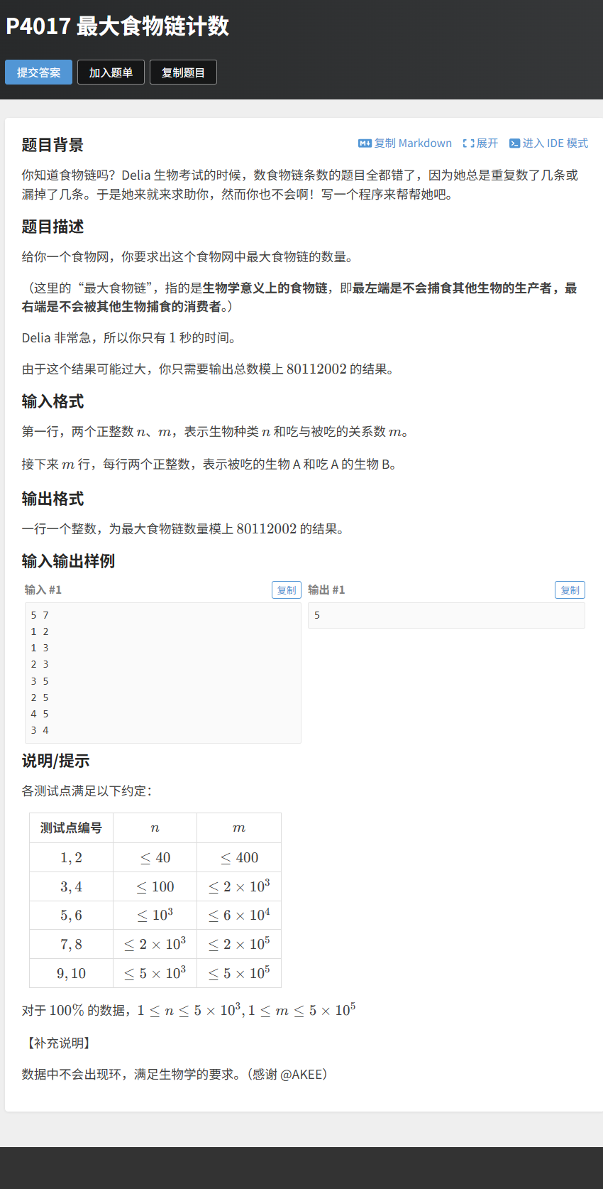 }示例输入中,生产者是 1(入度为 0),消费者是 5(出度为 0)。以 5 为终点的食物链有:1→2→3→5、1→2→5、1→3→5、1→3→4→5、1→2→3→4→5,共 5 条,因此输出