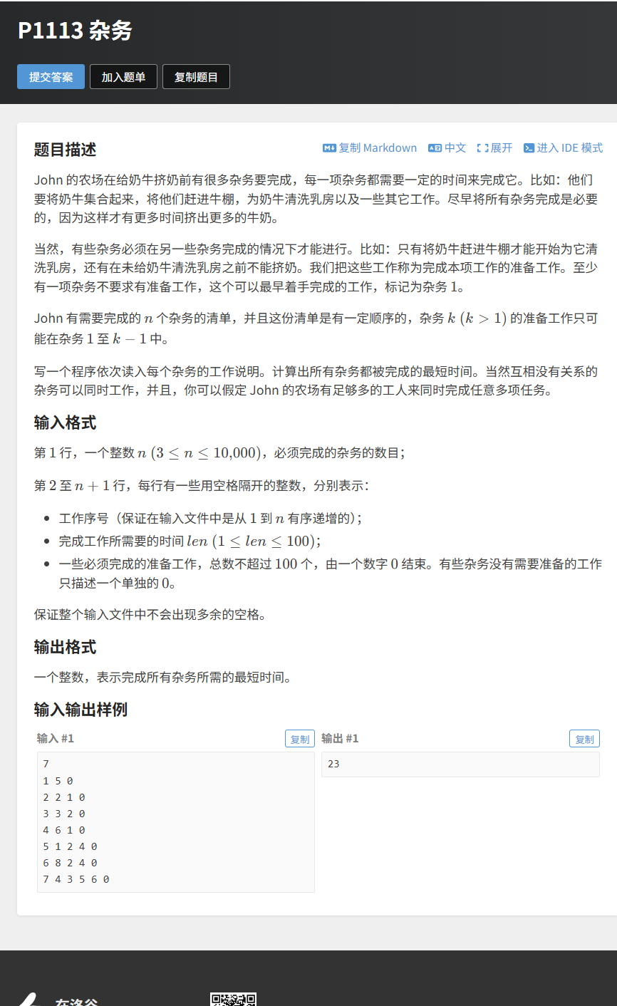 John 的农场在挤奶前有很多杂务要完成,有些杂务必须在其他杂务完成后才能进行。请计算完成所有杂务所需的最短时间(互相无关的杂务可以同时进行)。