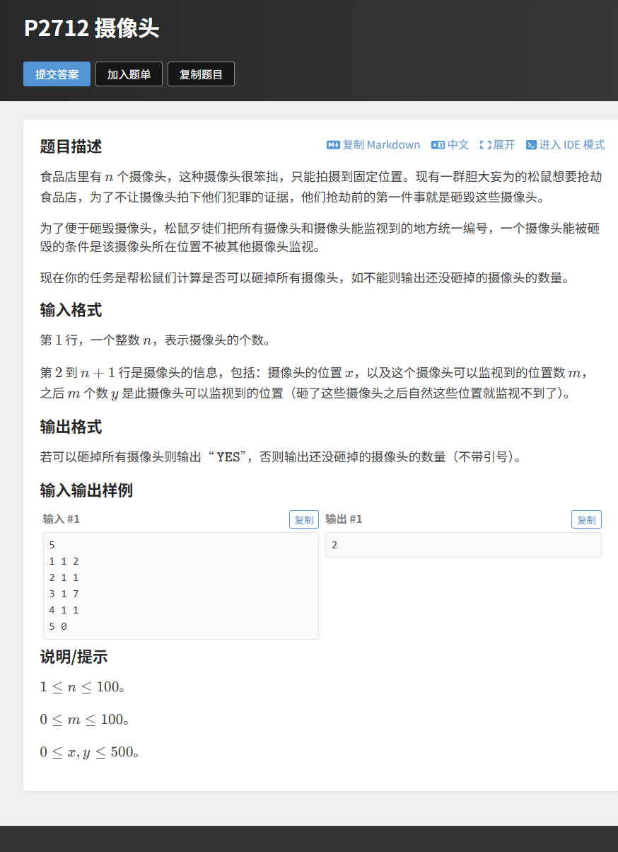 }示例输入中,摄像头位置 1 和 2 形成环(1 监视 2,2 监视 1),无法被砸毁;位置 3 监视 7(无摄像头),入度为 0,可被砸毁;位置 4 监视 1(入度 1,砸毁 1 后入度为 0,可被砸毁);位置 5 无监视对象,入度为 0,可被砸毁。被砸毁的摄像头数为 3,总摄像头数为 5,因此未被砸毁的数量为 2,输出