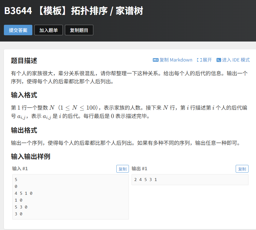 <u, v>,必须将 v 的入度加 1,而不是 u 的入度。in_stack数组检测回边,仅使用visited数组无法区分 “已处理完的顶点” 和 “当前路径上的顶点”,会导致环检测错误。如果题目要求输出 “字典序最小” 的拓扑序列(比如顶点编号从小到大),只需将 Kahn 算法中的普通队列替换为优先队列(小根堆),每次取出入度为 0 的顶点中编号最小的。