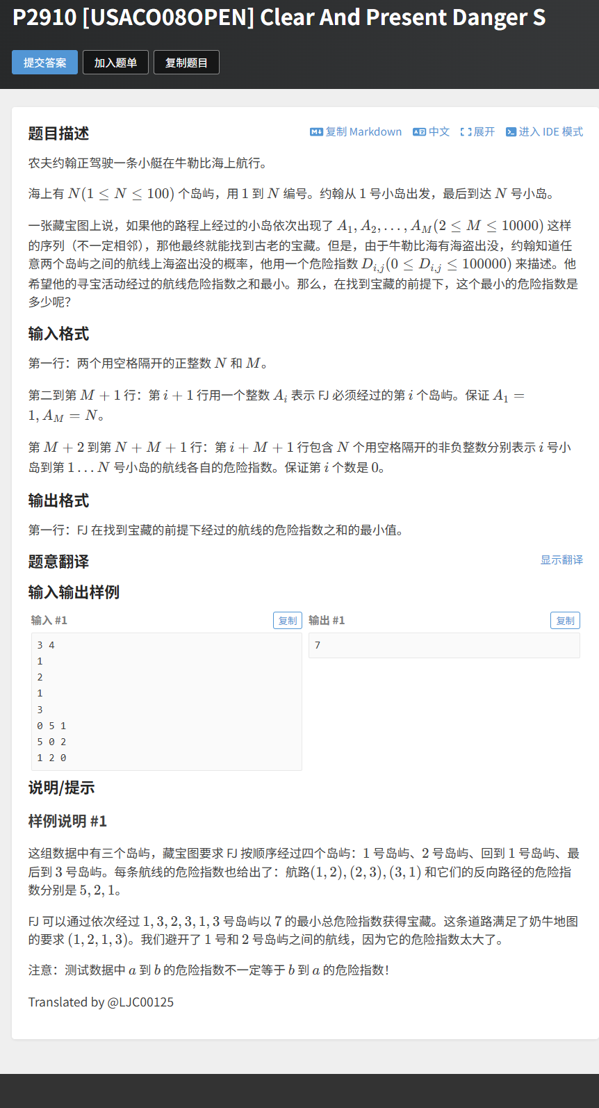 1 2 07D[i][j]是直接航线的危险指数,但可能存在经过其他岛屿的更短路径(危险指数更小);A₁ → A₂ → ... → Aₘ,累加相邻岛屿的最短危险指数之和,即为答案。#include <iostream>