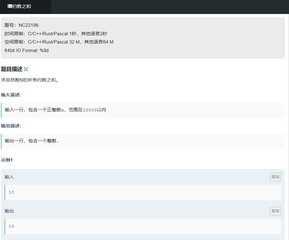 题目描述:求自然数 N 的所有约数之和(N≤1e4)。