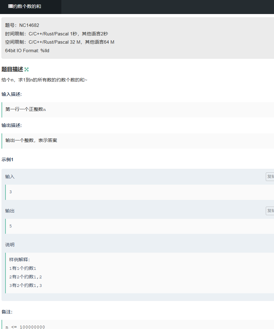 题目描述:给定 n,求 1 到 n 的所有数的约数个数的和(n≤1e6)。