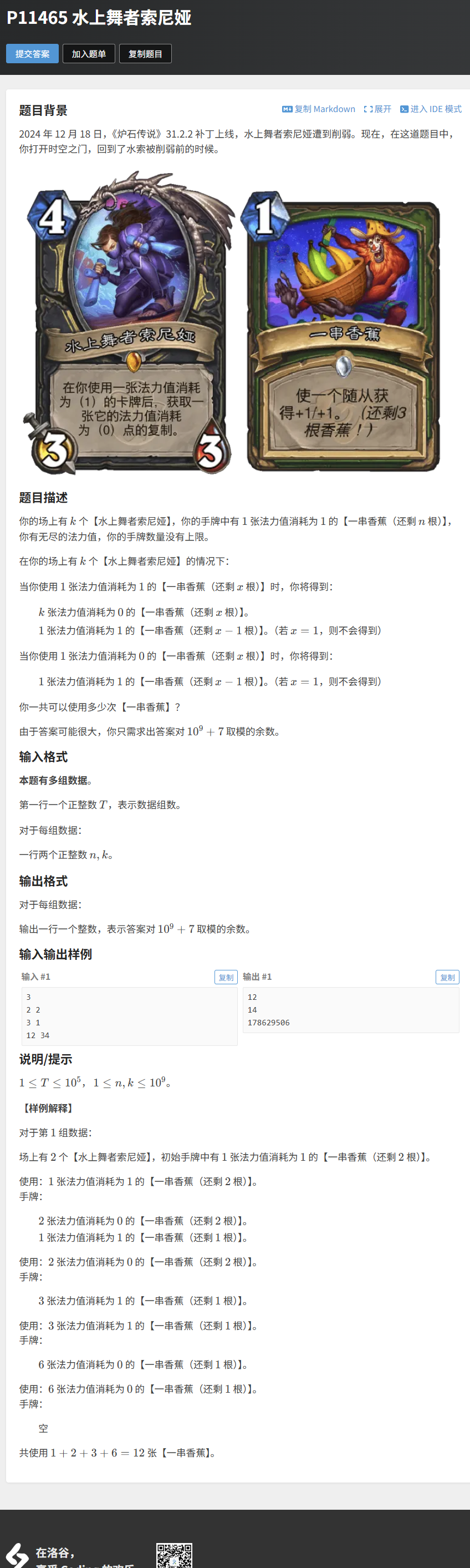 }long long存储所有变量,且每次乘法后都取模,避免大数相乘导致的溢出;a*a不超过long long范围,若超过需用快速乘优化)。题目链接:https://www.luogu.com.cn/problem/P11465