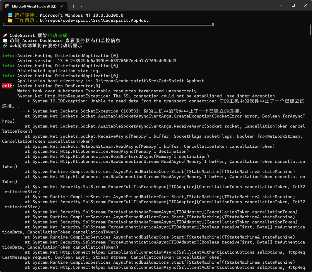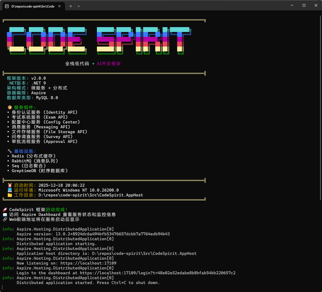 cd code-spiritCodeSpirit使用Aspire自动管理所有依赖服务,无需手动启动Docker容器:
