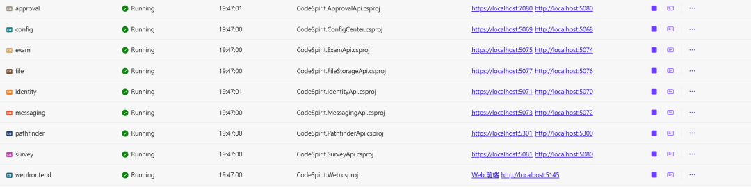 └── CodeSpirit.sln # 解决方案文件项目使用以下默认配置,由.NET Aspire自动管理: