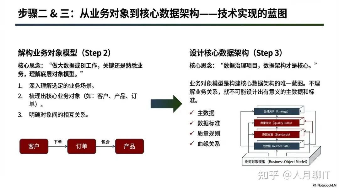 实现业务驱动数据治理的关键,在于理清从业务驱动到数据驱动的逻辑链路,核心是将模糊的业务需求,转化为坚实、清晰的数据架构。这条实践路径可以概括为以下几个步骤: