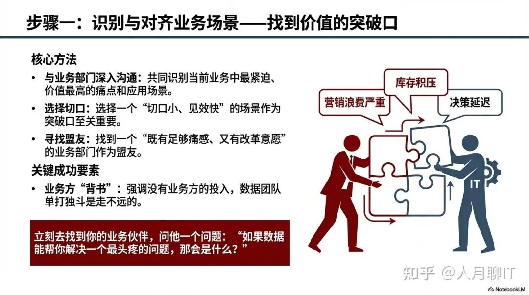 - 识别与对齐业务场景首先,数据团队必须与业务部门进行深入沟通,共同识别出当前业务中最紧迫、价值最高的痛点和应用场景。选择一个切口小、见效快的场景作为突破口至关重要。这里的关键是找到一个既有足够痛感、又有改革意愿的业务部门作为盟友。没有业务方的“背书”和投入,数据团队单打独斗是走不远的。