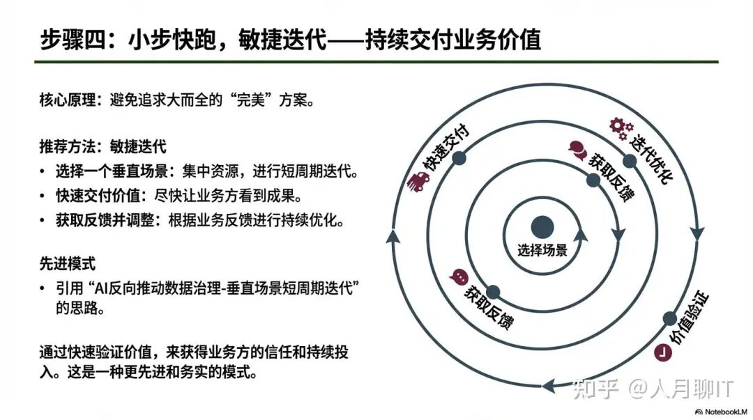 - 小步快跑,敏捷迭代: 避免追求大而全的“完美”方案。倡导采用敏捷方法,选择一个垂直场景进行短周期迭代,快速交付价值,并根据业务反馈进行调整。这种“AI反向推动数据治理-垂直场景短周期迭代”的思路,通过快速验证价值来获得业务方的信任和持续投入,是当前更先进和务实的模式。