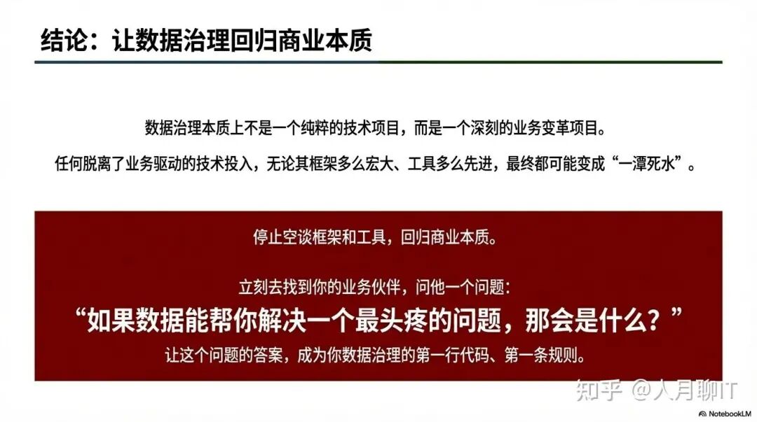 归根结底,数据治理本质上不是一个纯粹的技术项目,而是一个深刻的业务变革项目。任何脱离了业务驱动的技术投入,无论其框架多么宏大、工具多么先进,最终都可能变成“一潭死水”,无法产生真正的商业价值。
