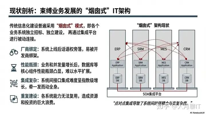 一是厂商绑定,系统上线后企业话语权旁落,易被开发商 “绑架”;二是性能瓶颈,随着业务和并发量增长,数据库等核心组件性能短板凸显,难以水平扩展;三是集成复杂,系统间接口集成难度呈指数级增长,牵一发而动全身;四是重复建设,各系统能力无法复用,造成资源和投资的巨大浪费。