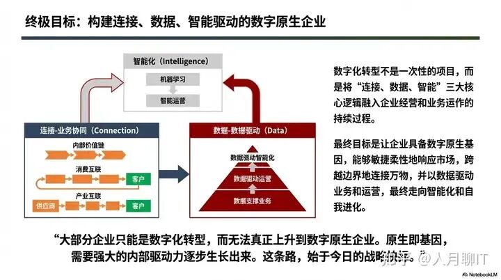 其终极目标,是让企业具备数字原生基因 —— 能够敏捷柔性地响应市场,跨越边界地连接万物,并以数据驱动业务和运营,最终走向智能化和自我进化。