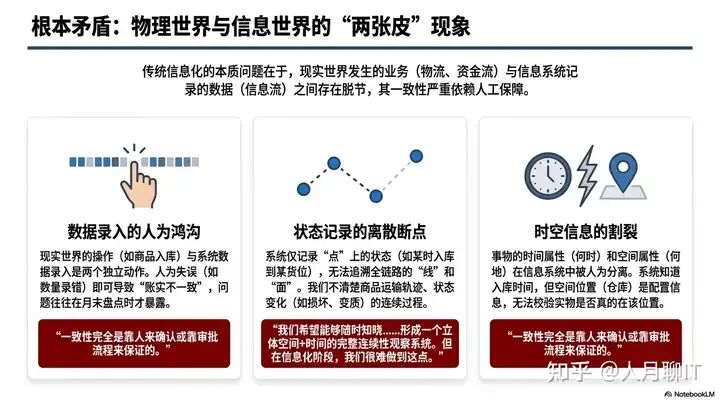 “烟囱式” 架构背后,隐藏着一个更核心的问题 —— 物理世界与信息世界的 “两张皮” 现象。传统信息化的本质缺陷,在于现实世界的业务(物流、资金流)与信息系统记录的数据(信息流)存在脱节,其一致性严重依赖人工保障。