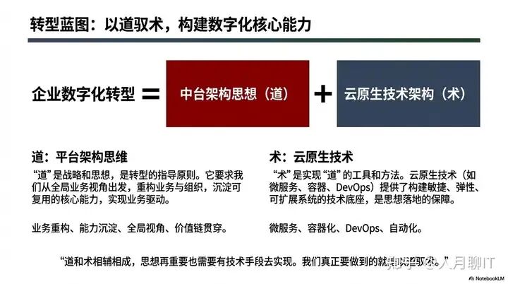 明确了愿景,接下来就是落地路径。企业数字化转型的核心逻辑,是 “以道驭术”—— 中台架构思想为 “道”,云原生技术架构为 “术”。