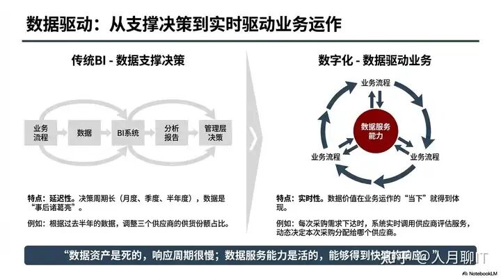 而数字化转型追求的是 “数据驱动业务”,数据被封装为数据服务,直接嵌入业务流程,在业务运作的 “当下” 就发挥价值。其特点是实时性,比如每次采购需求下达时,系统实时调用供应商评估服务,动态决定本次采购分配给哪个供应商。